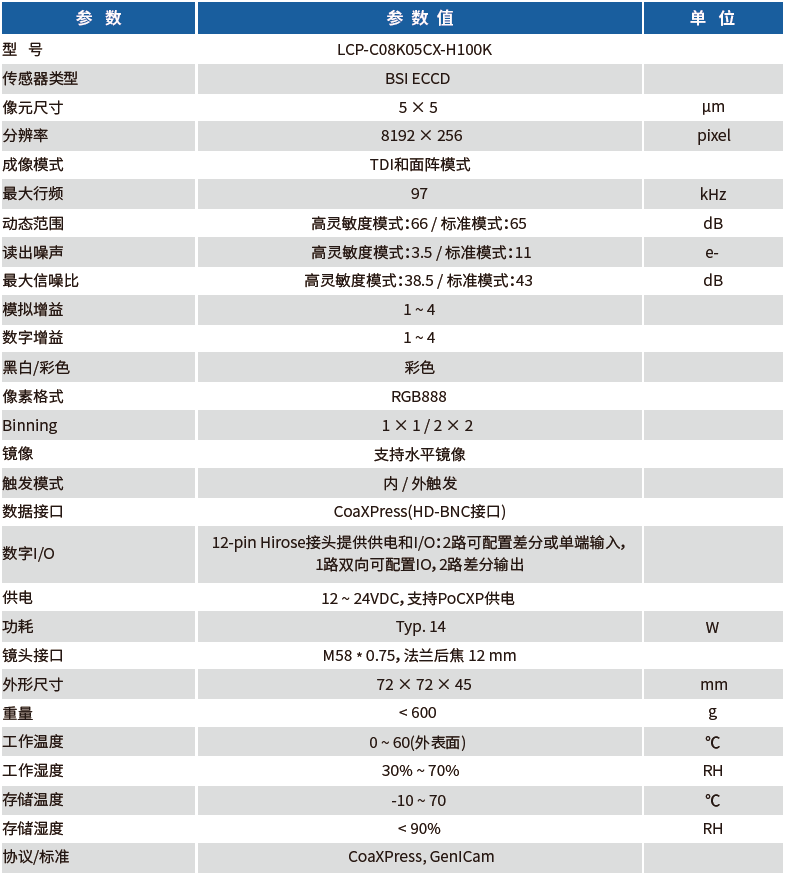 LCP-C08K05CX-H100K工业线阵相机,采用8192x256线TDI彩色ECCD Sensor,该Sensor同时兼具CCD TDI传感器的高灵敏度、高信噪比以及CMOS TDI传感器的高速度、低功耗的优点,代表业内最先进水平。提供散热片、风扇等多种散热方式,用以适应更多的工业应用场景。