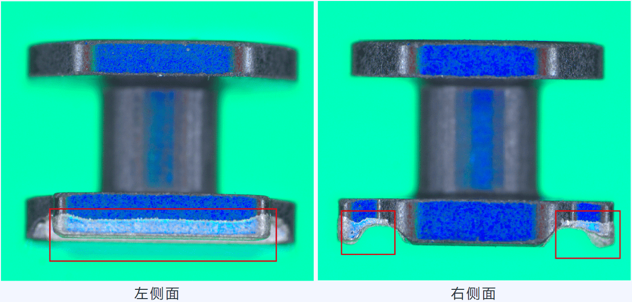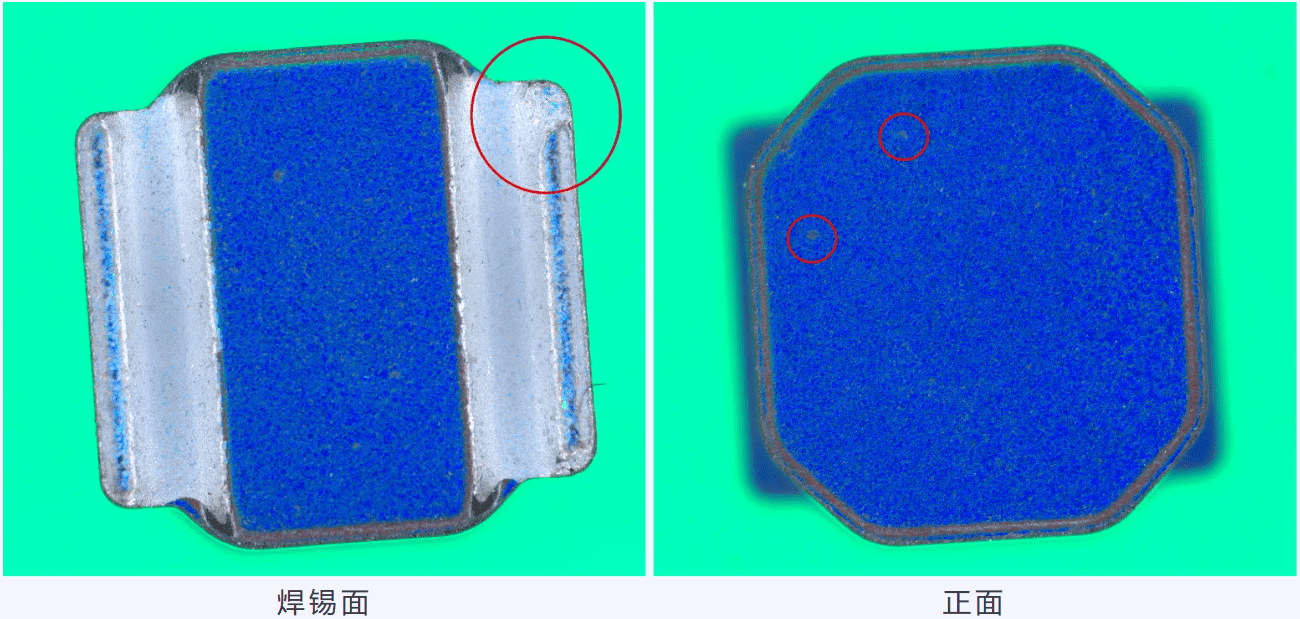 通过多色打光方式,使缺陷与正常背景面具有不同颜色区分,让缺陷凸显出来。如焊锡面右边崩缺,蓝色覆盖面积变小变短明显,正面崩点具有异样的颜色对比,其他面效果类似,这些非常明显的图像对比信息,很好的方便后续机器视觉算法分析处理。