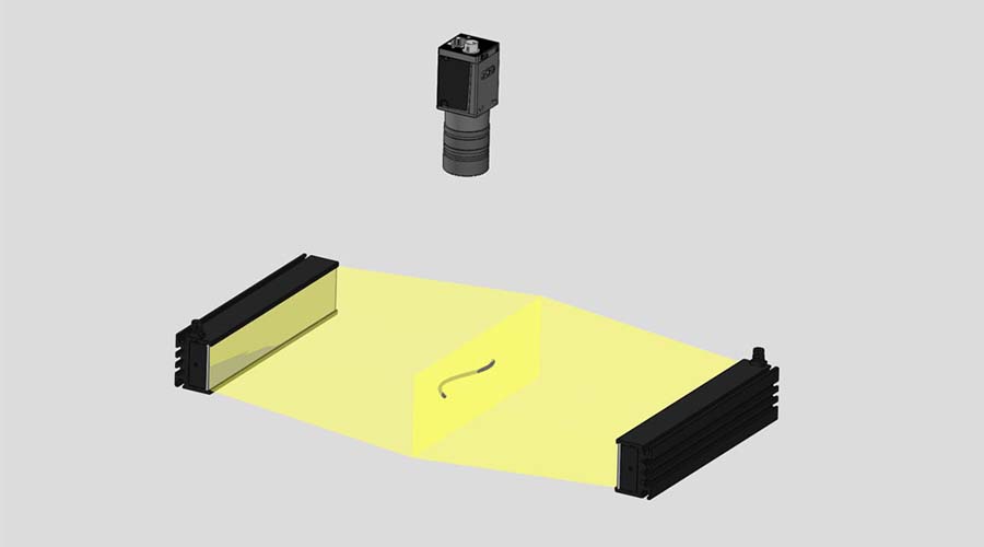 使用环形光源两侧面打光,线表面打黑,缺陷打亮,黑白对比明显。