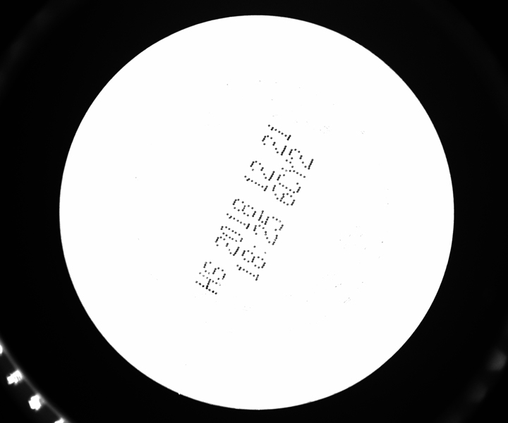 1、晶元字符检测,产品表面磨砂不易反光,使用高角度环形光源把字符打亮,表面背景为灰黑,与白色字符对比明显。