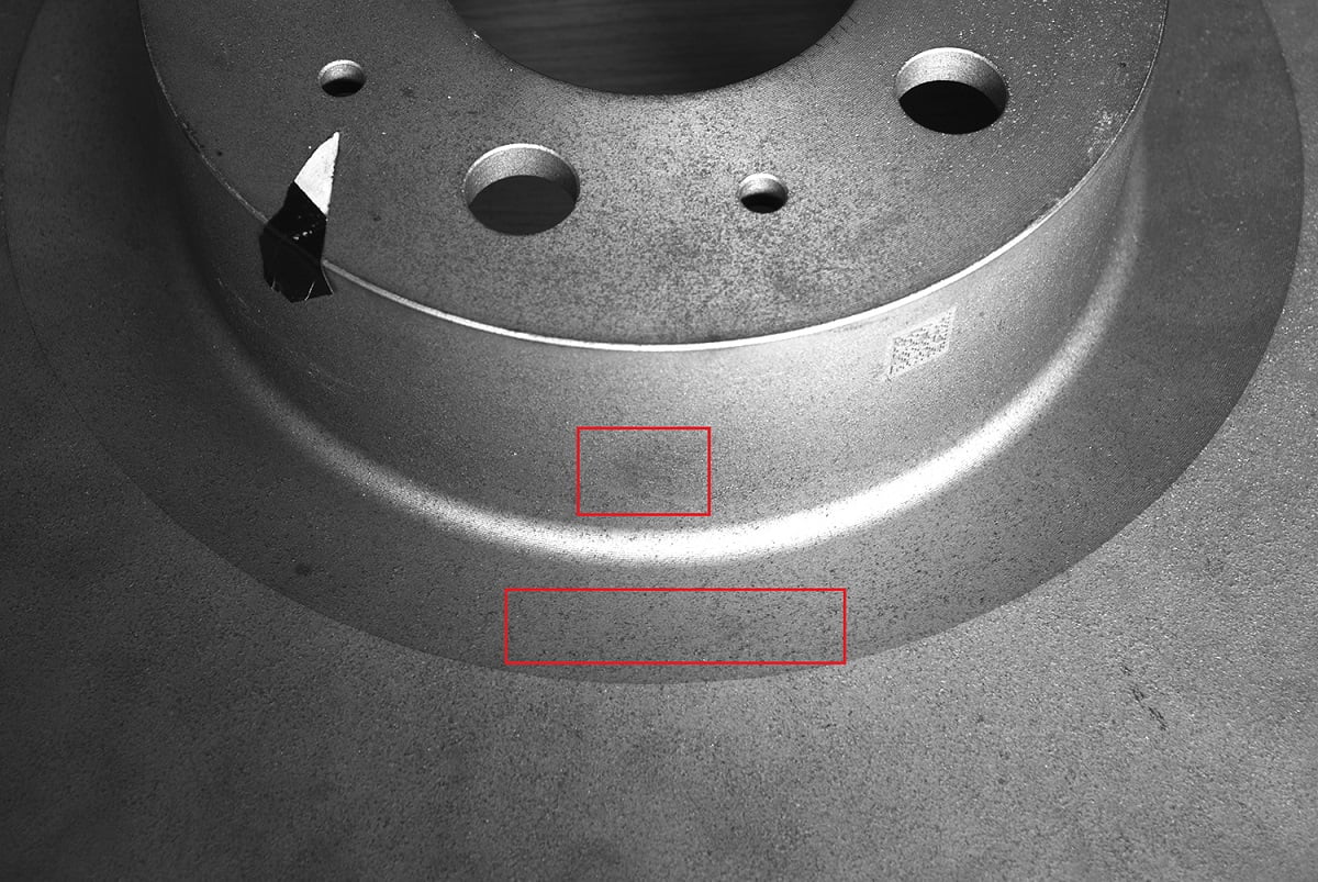 刹车盘正面尺寸大(直径 30-40cm)且带散热筋(高低差 1-2cm),普通光源易产生阴影。采用“大景深短焦镜头结合开孔面光源”组合,镜头覆盖高低差区域避免失焦,面光源均匀照射消除阴影。测试显示,0.5mm 划痕、0.3mm 砂眼呈明显黑色,与浅灰色背景对比清晰,无漏判(如图1所示)。